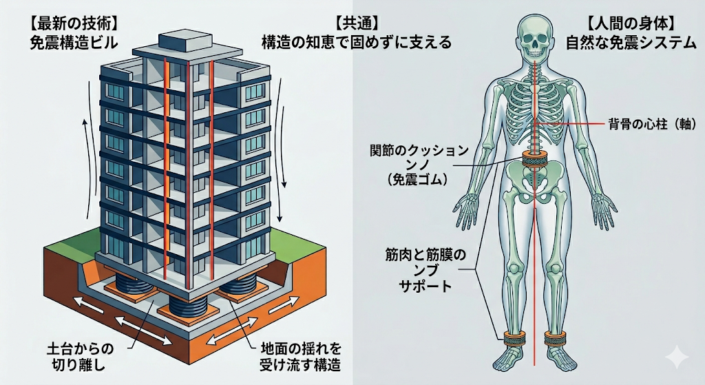私たちの身体は、五重塔のようなしなやかさと、スカイツリーのような緻密な制御機能をあわせ持った、最高の「ハイブリッド構造体」です。