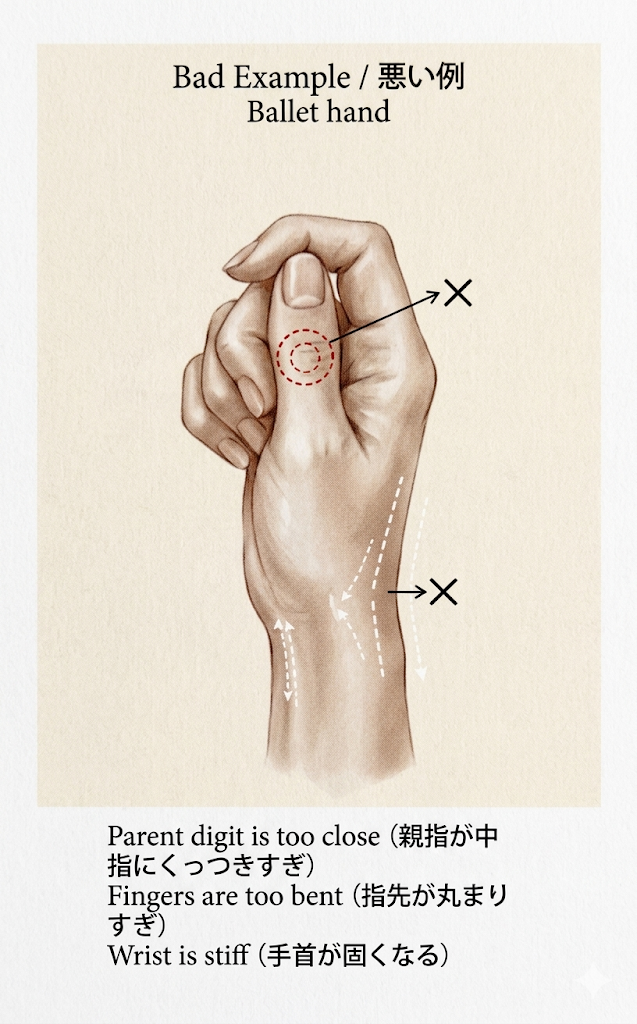 大切なのは指先をくっつけることではなく、手首に近い「親指の根元(母指球)」をふっくら立てること。この「四角い窓」があるだけで、手は驚くほど自由に、そして優雅に動くようになります。