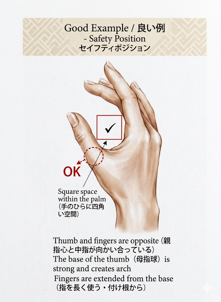 整体(仕事): 指を反らせず、この「四角い窓」を保って圧を入れるから、施術者も痛めず、受ける方も心地よい。