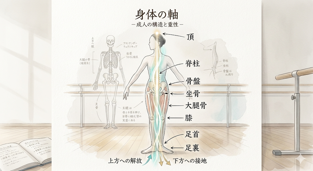 バレエの「軸」は、単なるイメージではなく、「頭頂・坐骨・足首・足裏」をつなぐ“構造としての通り道”として捉えることで安定しやすくなると感じています。そして重要なのは、同じ動きをしていても、毎回“内側の使い方は違う”という観察の視点です。この2つが、大人バレエの上達の本質だと今は考えています。